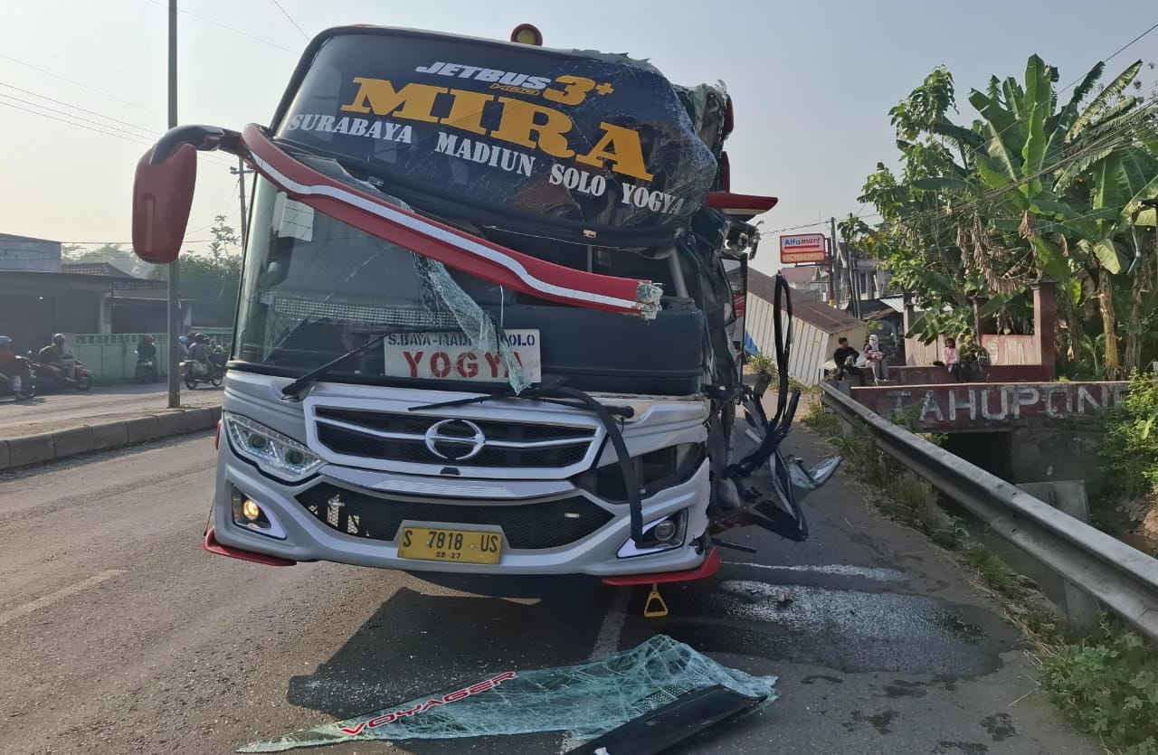 Kecelakaan diperkirakan terjadi sekitar pukul 07.30 WIB. Bus bernomor polisi S 7818 US yang dikemudikan Arif Nur Hidayat (34), warga Trawas, Mojokerto, melaju dari arah Surabaya menuju Yogyakarta dengan membawa sekitar 30 penumpang.