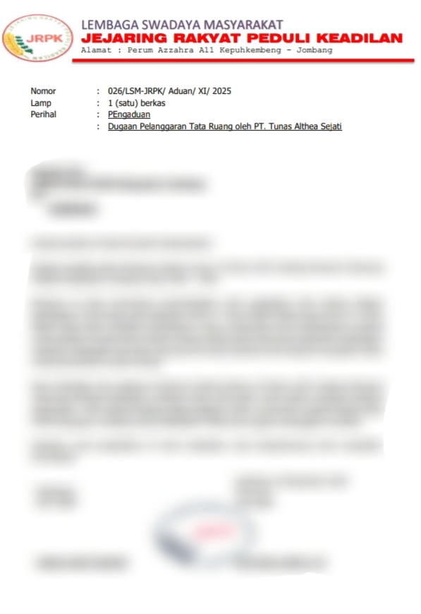 Jombang ,SeputarJombang.Com — LSM Jejaring Rakyat Peduli Keadilan (JRPK) mengungkap dugaan pelanggaran tata ruang yang dilakukan PT Tunas Althea Sejati di Desa Catak Gayam, Kecamatan Mojowarno. Aktivitas pembangunan gedung dan pengurukan lahan yang mengarah pada kegiatan industri disebut bertentangan dengan peta zonasi resmi Kabupaten Jombang.