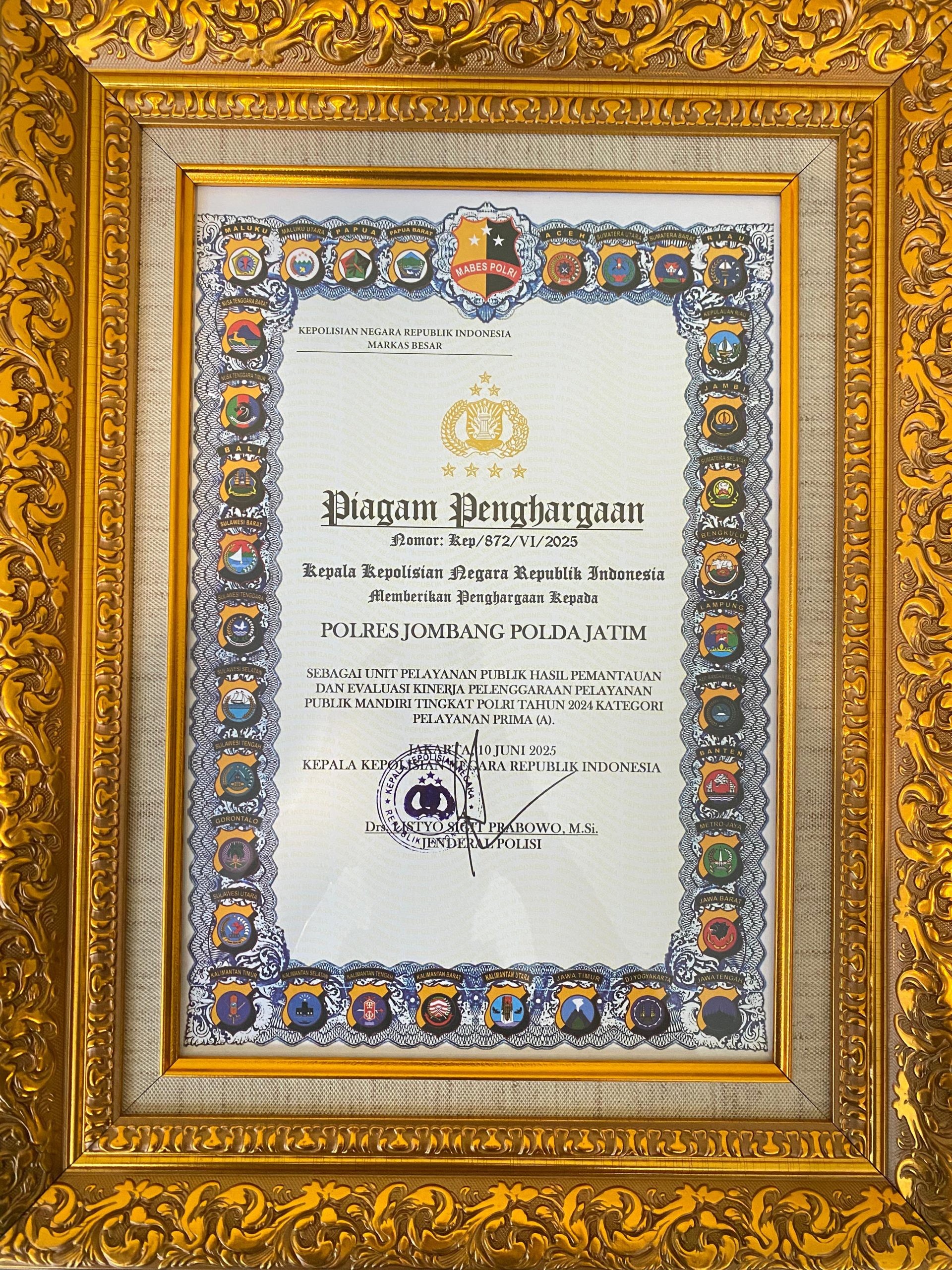 SeputarJombang.com – Polres Jombang mengukir prestasi membanggakan dengan meraih penghargaan sebagai unit pelayanan publik terbaik dalam pemantauan dan evaluasi kinerja penyelenggaraan pelayanan publik mandiri tingkat Polri tahun 2024 kategori pelayanan prima A bertempat di Gedung Mutiara PTIK, Jl. Tirtayasa No. 6 Melawai, Kebayoran Baru, Jakarta Selatan, pada Kamis (19/06/2025).