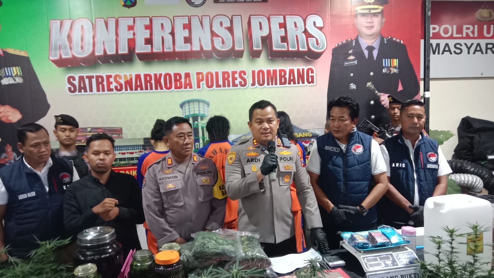 “Dari hasil pengembangan, tim Resnarkoba Polres Jombang mengamankan dua orang lagi, saudara P dan saudari I, yang merupakan pasangan suami istri.Tersangka P memberikan modal kepada R untuk menanam dan merawat ganja. Sedangkan istri P bertugas membantu membeli barang-barang yang dibutuhkan,” kata AKBP Ardi Kurniawan dalam konferensi.Kamis (18/12/2025).
